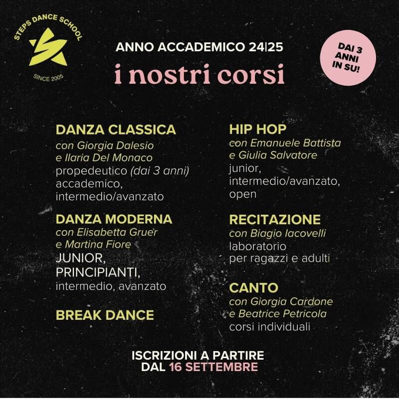 STEPS DANCE SCHOOL è una scuola nata nel 2005. Un'istituzione dedicata alla formazione artistica di talenti emergenti nel campo della danza, del canto e della recitazione. Con una combinazione di professionalità, passione e innovazione, ci impegniamo a guidare i nostri studenti verso il successo e la realizzazione dei loro sogni.